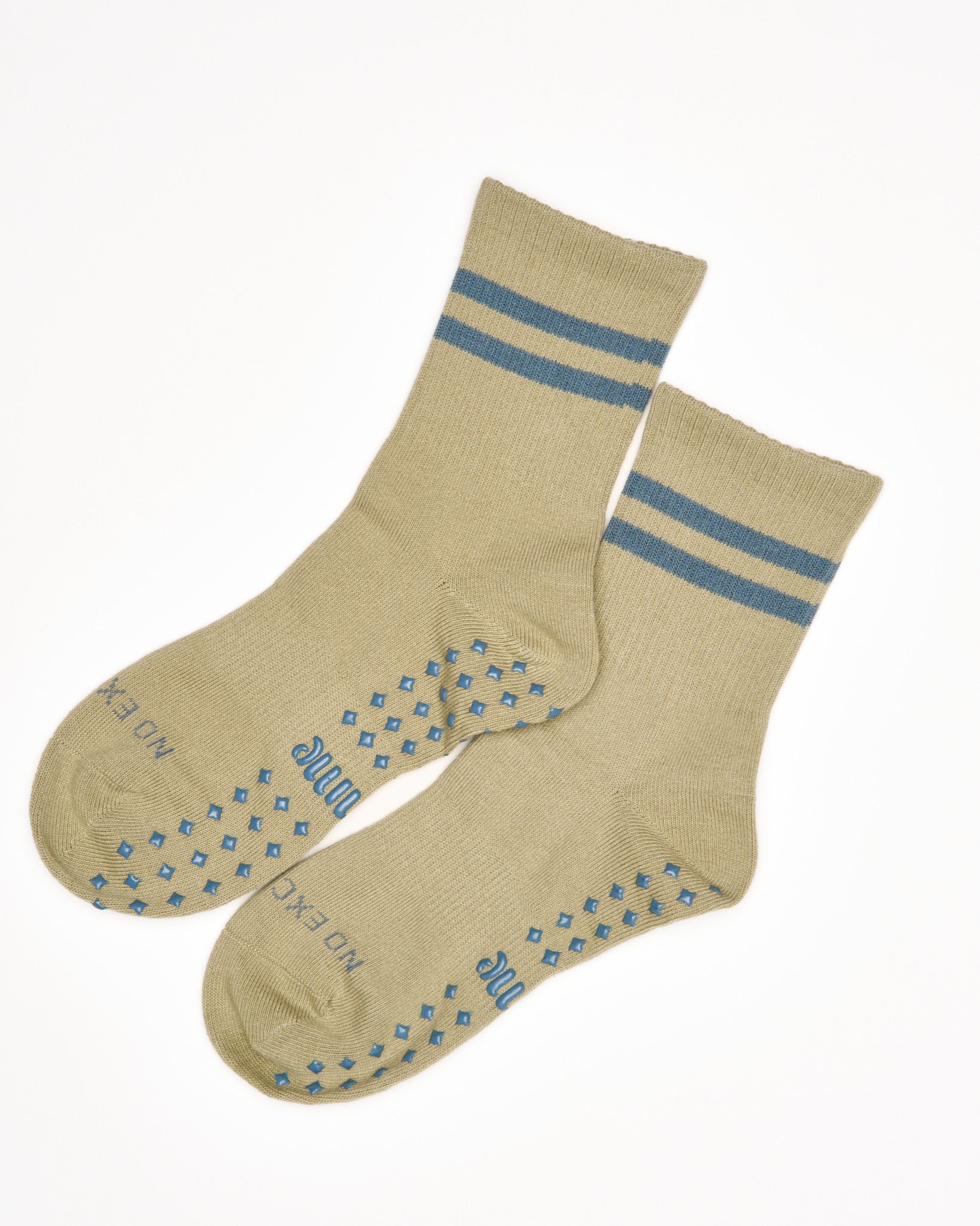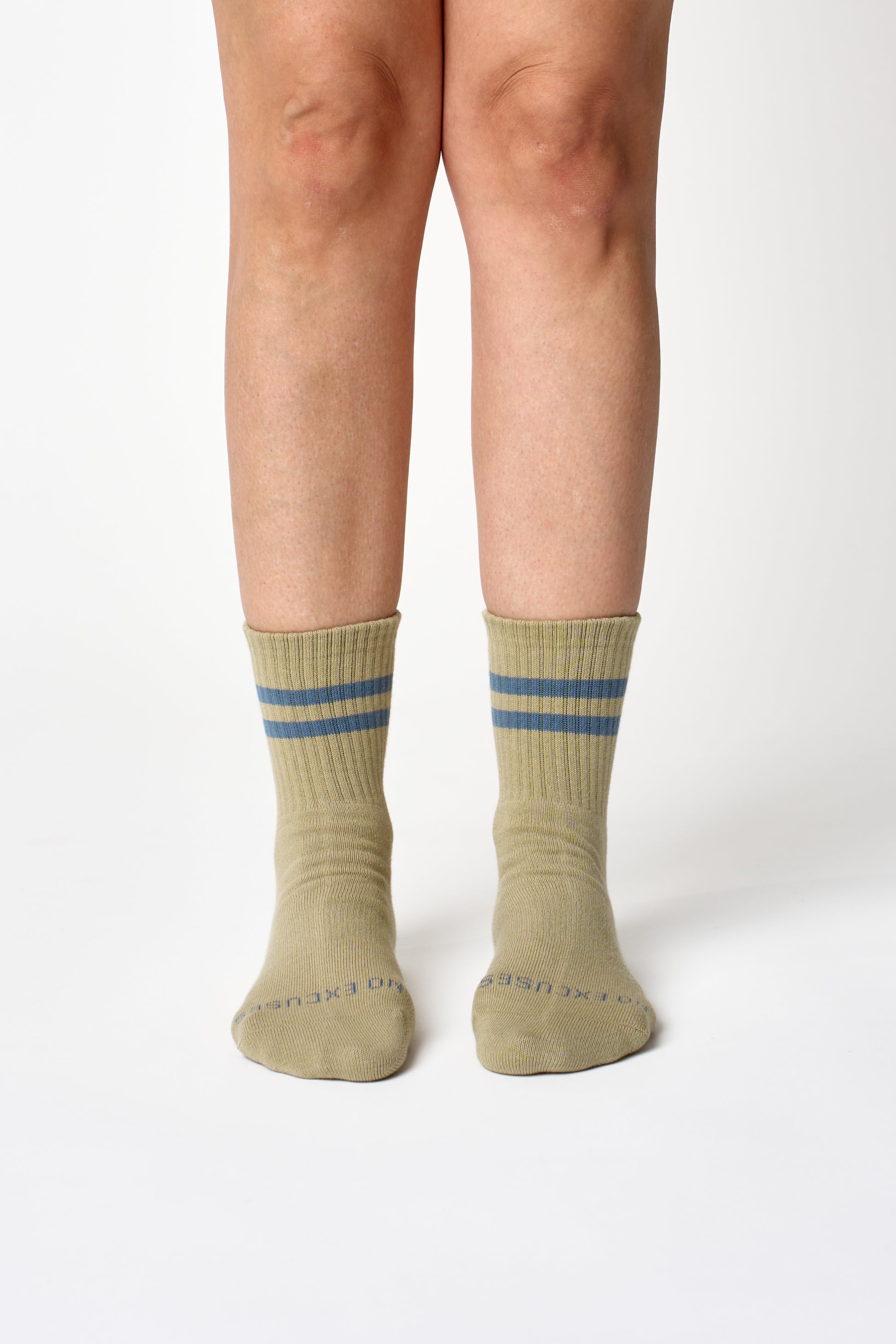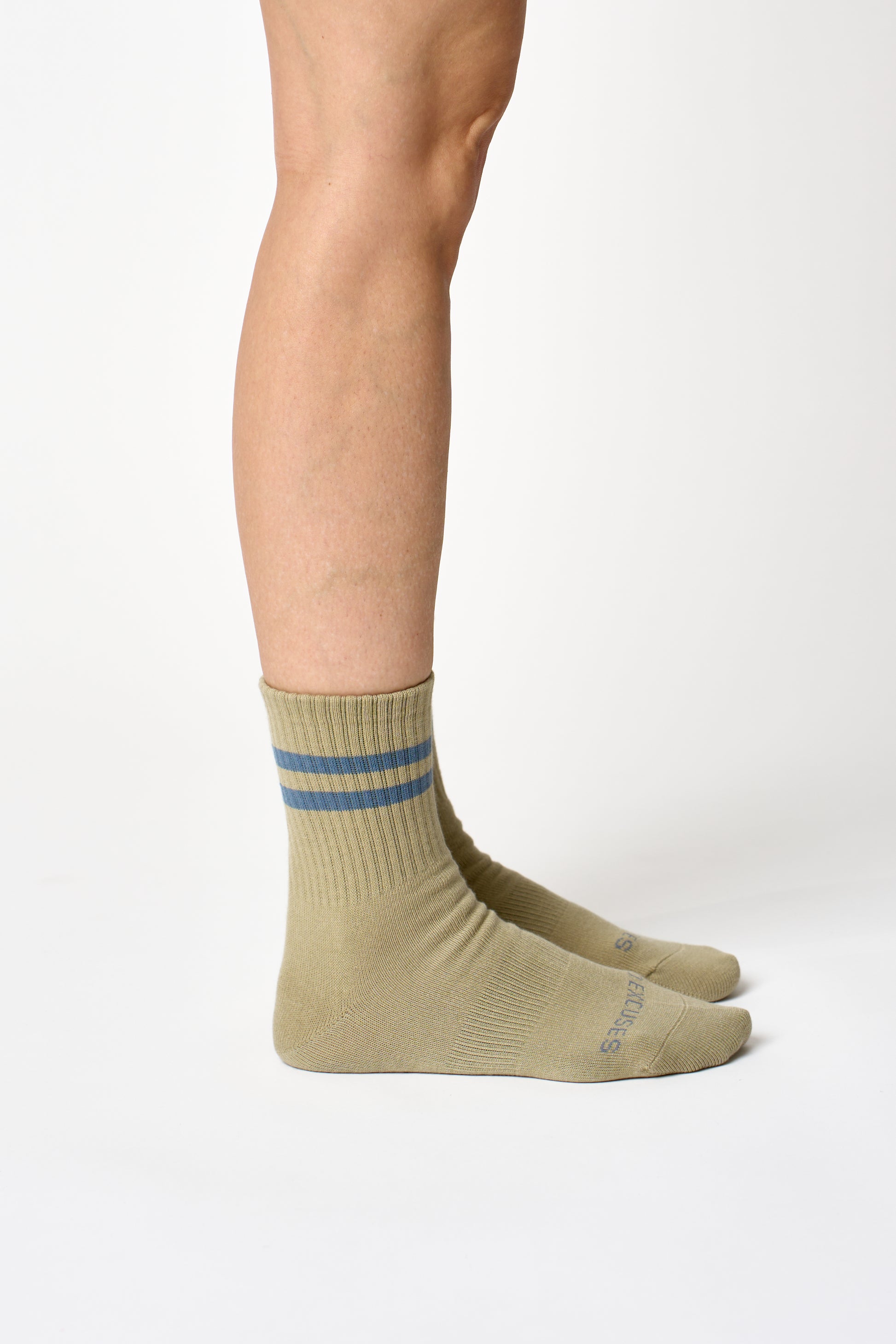 Earthy, grounded, and annoyingly good-looking. Warm olive with dusty blue stripes — the sock for the girl who orders matcha, hits every class, and still makes it look effortless.