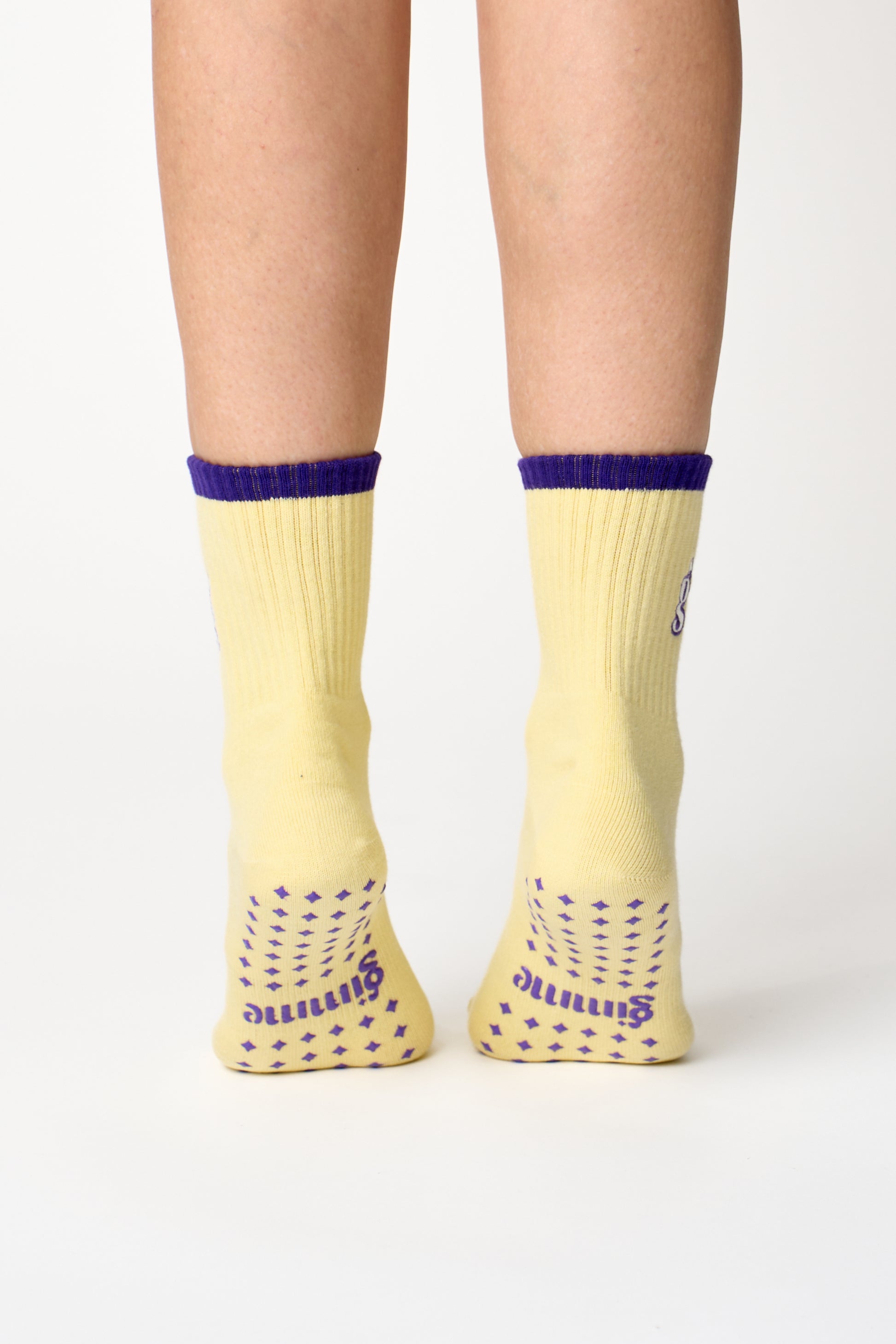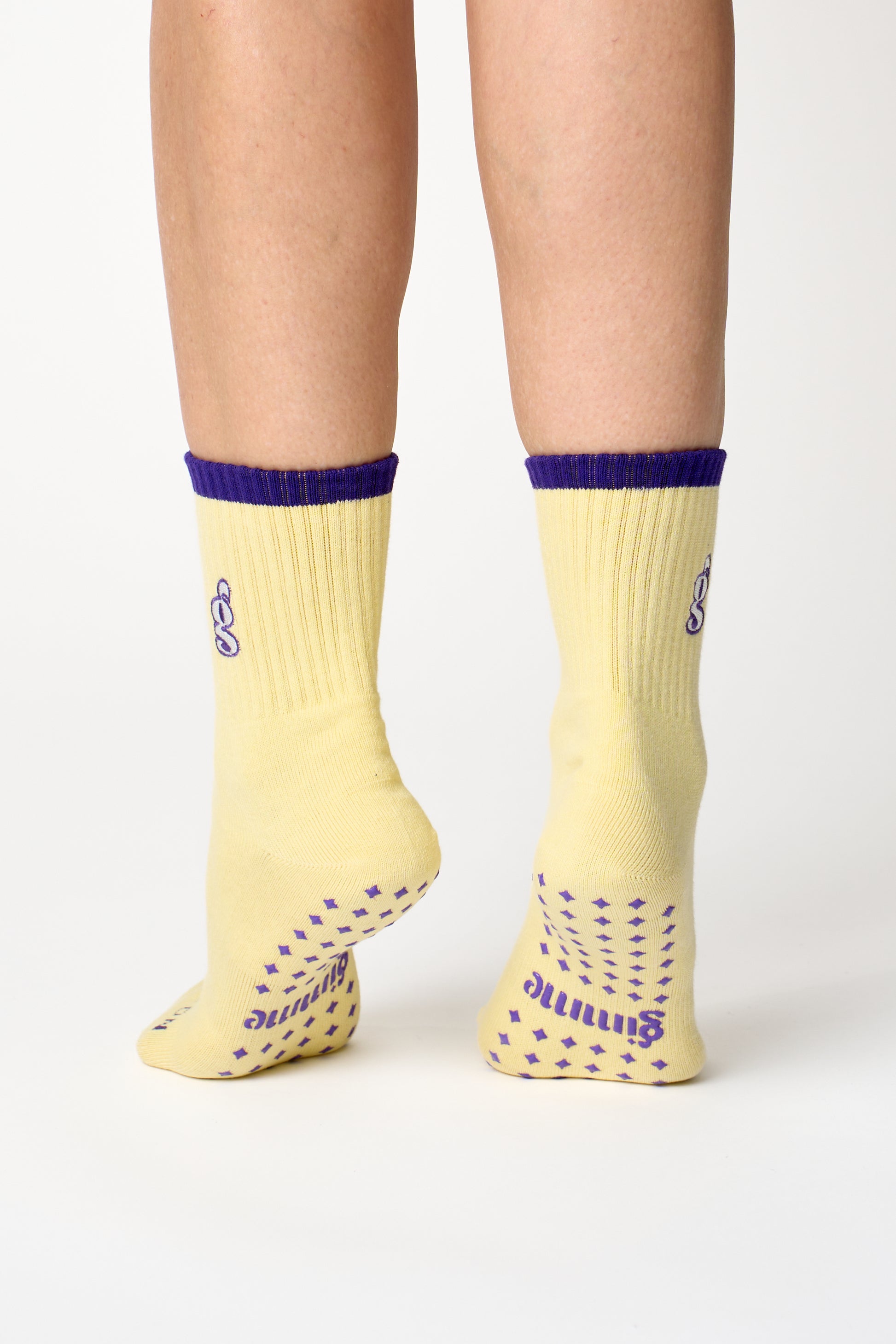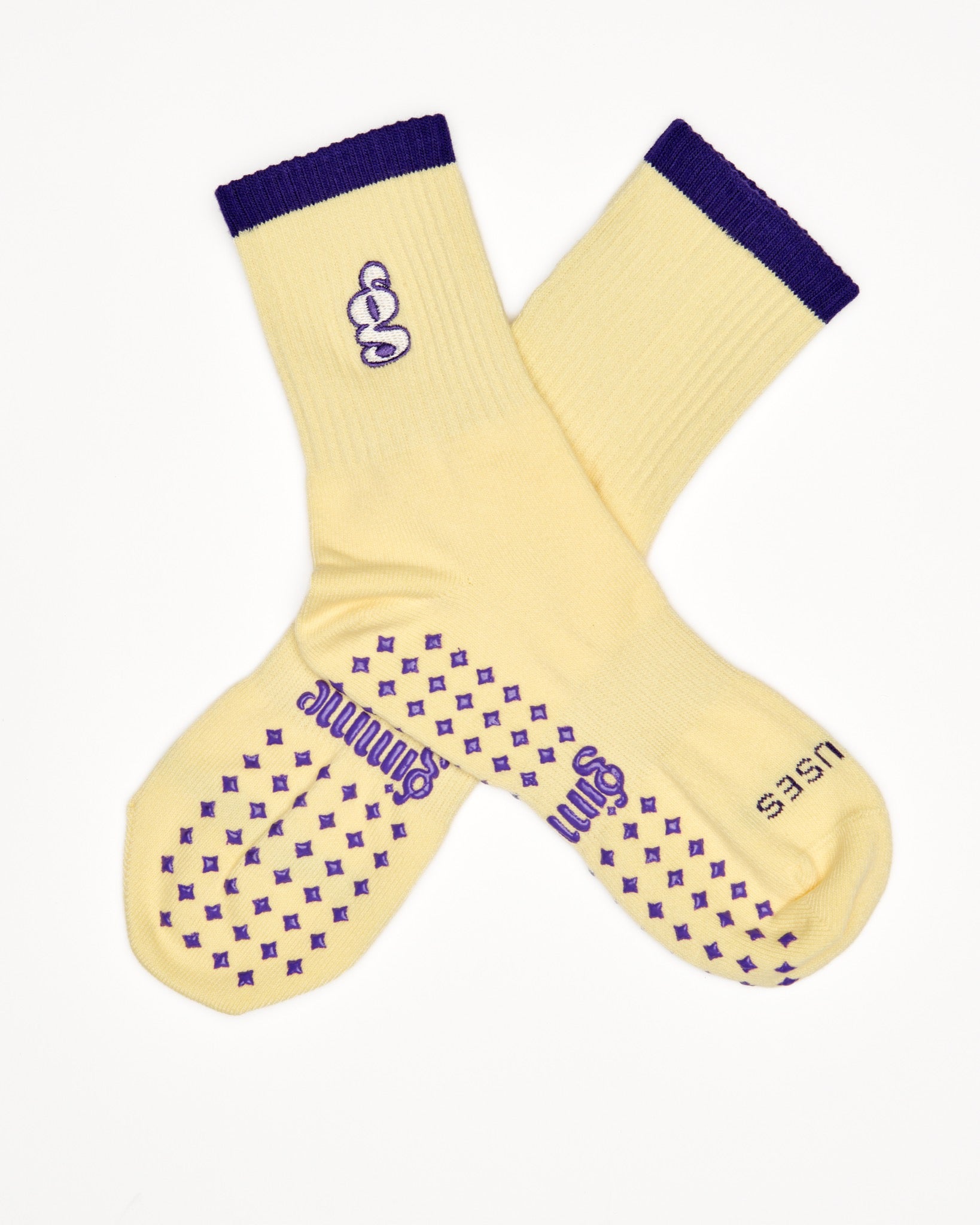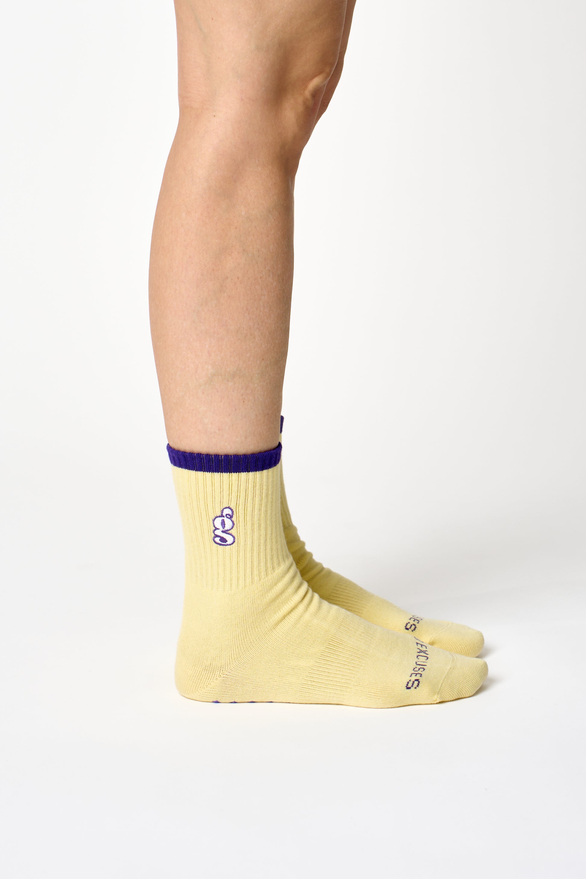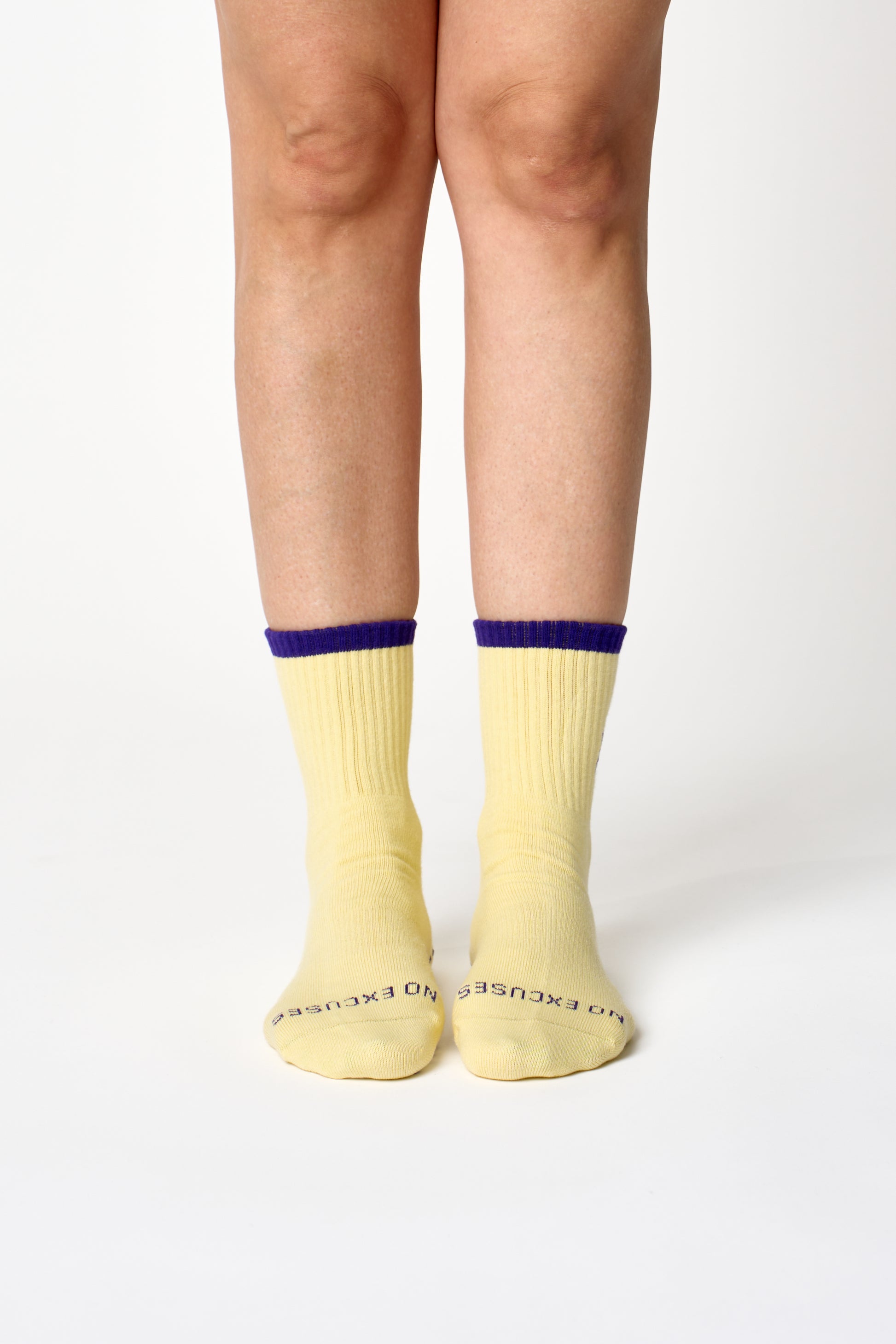 Soft butter yellow with a rich purple cuff — the morning energy you want without the alarm clock attitude. Slip these on and suddenly a 7am class sounds like a great idea.